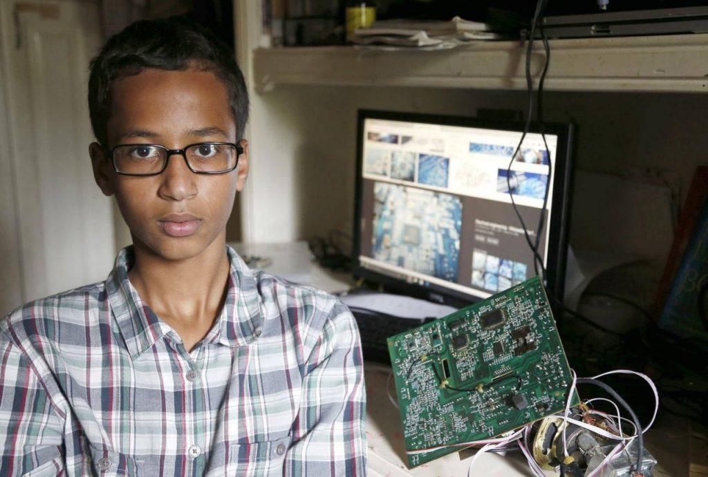 One of the more interesting factoids from the many simpering, boot-licking press accounts of Ahmed the poor bomb hoax clockmeister: “Before we left for the television studio, Ahmed had taken me into his bedroom to show me the now-famous desk where everything gets built. I asked if I could take a picture; he nodded and sat on his desk chair holding up a tangle of wires, and, seeing his Koran