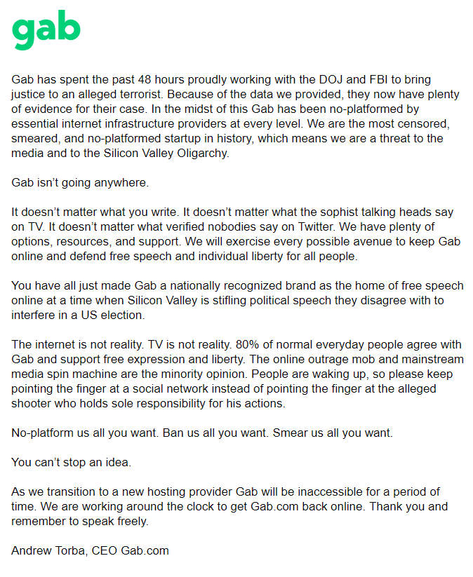 “We have plenty of options, resources, and support,” he wrote. “We will exercise every possible avenue to keep Gab online and defend free speech and individual liberty for all people.”