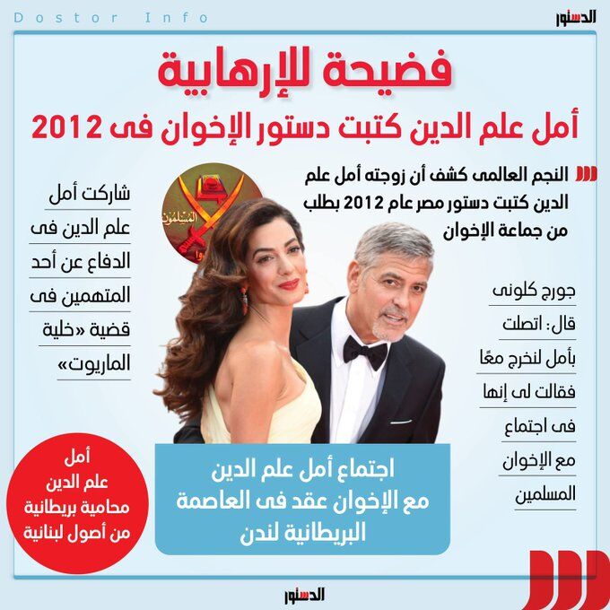 Egyptian newspaper Al-Dustour highlighted remarks by Hollywood star George Clooney, stating that his wife, Amal Clooney, a British-Lebanese lawyer, drafted Egypt’s 2012 constitution at the request of the Muslim Brotherhood.