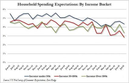 The biggest culprit in the collapse in spending intentions was the middle class (those making between $50 and $100K) but mostly the wealthy, those with incomes over $100K. It was the latter whose spending expectations dropped to, you guessed it, the lowest in series history.
