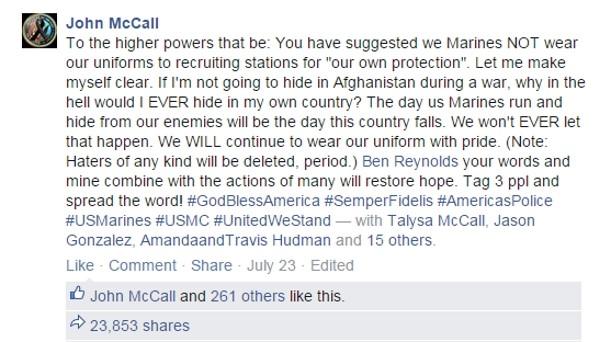 Upon hearing the recommendations, McCall took to Facebook and wrote, “To the higher powers that be: You have suggested we Marines NOT wear our uniforms to recruiting stations for “our own protection”. Let me make myself clear. If I’m not going to hide in Afghanistan during a war, why in the hell would I EVER hide in my own country?”