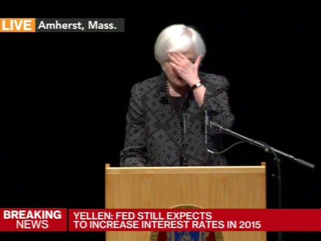 Rightly or wrongly, Yellen’s ‘falter’ on stage could trigger further rumblings about confidence in the United States’ private central banks, and in world markets generally, which are now falling and could collapse with the right piece of bad news.