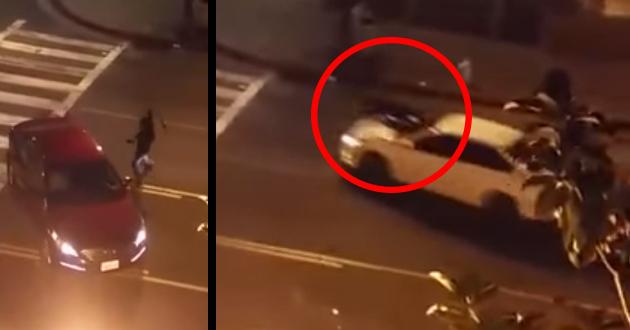 However, as soon as the man gets up and the car pulls forward, another vehicle runs into the man throwing him up onto the windshield and then into the street.