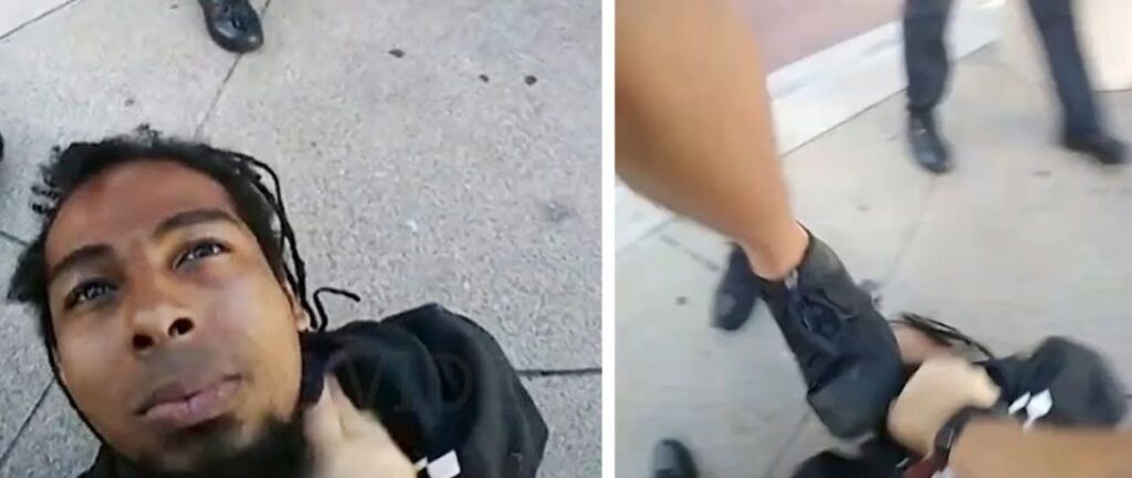 As the video shows, bike officer Matthew Shores is throwing Vaughn around like a ragdoll despite the fact that he’s in handcuffs. He then grabs the man by the neck before slamming him down to the ground for no apparent reason.