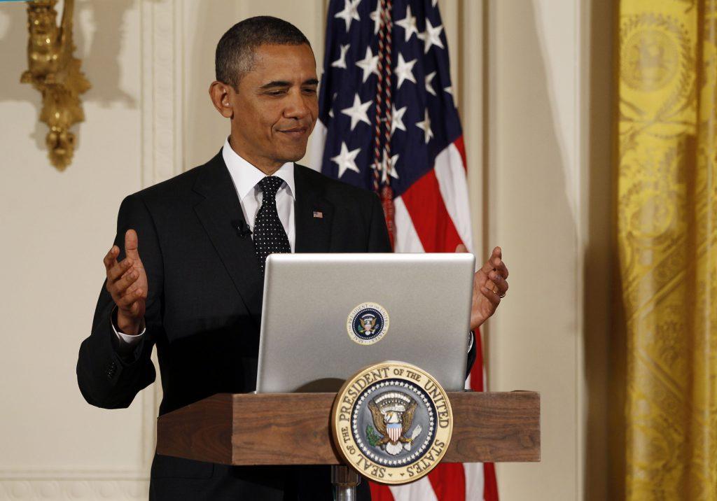 U.S. President Barack Obama reacts after tweeting at his first ever Twitter Town Hall in the East Room at the White House in Washington, July 6, 2011. REUTERS/Larry Downing (UNITED STATES - Tags: POLITICS SCI TECH IMAGES OF THE DAY) - RTR2OJOJ